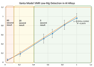 要想快速探究鋁合金當(dāng)中的少量鎂元素一直都是手持式光譜儀需要攻克的難題,因為要準確地探定鋁合金當(dāng)中的鎂元素會需要很長的檢測時間。隨著經(jīng)濟不斷發(fā)展,工程師們也對硬件技術(shù)的進步以及先進的Axon技術(shù)的采用,而奧林巴斯Vanta光譜儀的技術(shù)已經(jīng)可以大大縮短鋁合金中準確的低含量鎂元素的檢測時間。