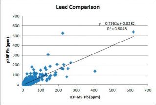 來(lái)自加拿大的金元素勘探項(xiàng)目,XRF分析儀在野外繪制的表面土壤中As、Cu和Pb元素等值線圖對(duì)比ICP分析。