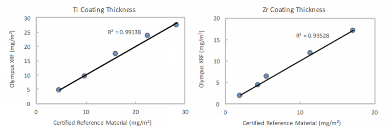 上述數(shù)據(jù)表明,使用Vanta手持式XRF分析儀獲得的鈦(Ti)、鋯(Zr)涂層厚度結(jié)果與參考材料的標(biāo)定涂層厚度有非常好的相關(guān)性。