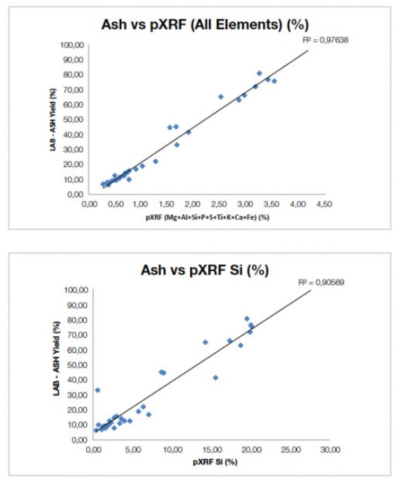圖1. 奧林巴斯手持式XRF光譜儀獲得的數(shù)據(jù)與經(jīng)認證的參考材料額定值之間有著密切的關聯(lián)性,因此使用組合輕元素替代物(Mg+Al+Si+P+S+Ti+K+Ca+Fe)或僅使用二氧化硅可以有效地估算灰分含量。如果元素組中的元素更全,還可以獲得更好的結(jié)果。