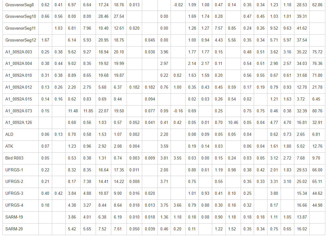 圖2. 奧林巴斯手持式XRF光譜儀檢測大量煤認證參考材料(CRM)獲得的結(jié)果與這些材料的標稱值高度吻合。上面的圖表表明對于重要元素:Mg、Al、Si、P、S、K、Ca、Ti和Fe,實驗室認證值和XRF分析儀獲得的數(shù)據(jù)值在準確性和精確性方面都表現(xiàn)出高度的一致性。 數(shù)據(jù)表包含了繪制這些圖表所依據(jù)的實驗室數(shù)據(jù)和XRF數(shù)據(jù)。數(shù)據(jù)承蒙新南威爾士大學生物和地球科學學院提供 - ACARP項目。