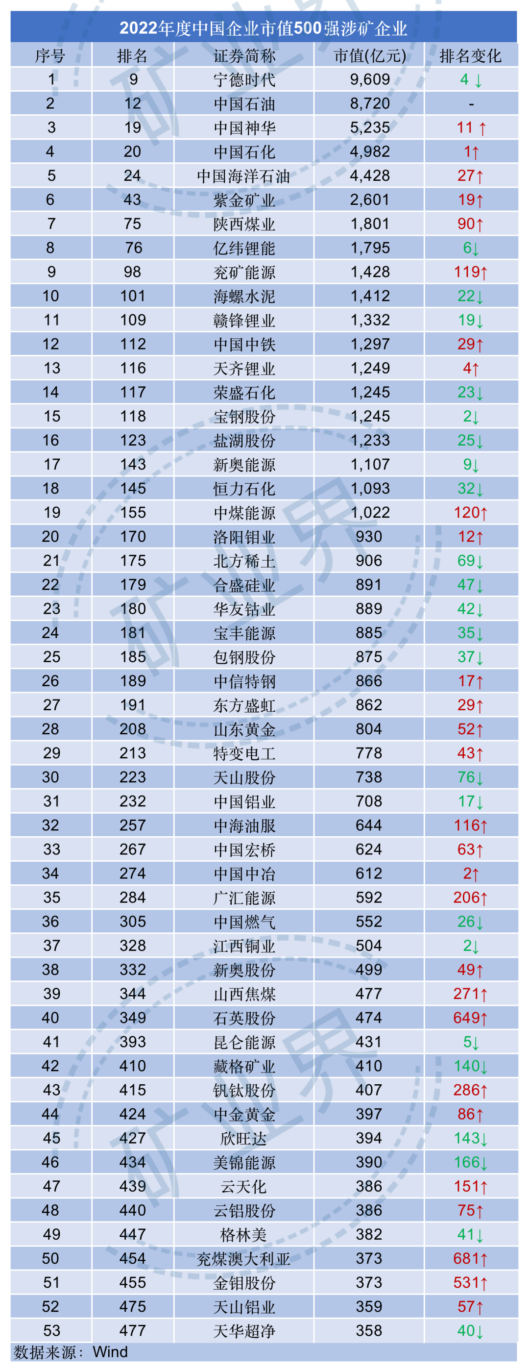 近日,Wind發(fā)布了2022年度“中國上市企業(yè)市值500強”榜單,礦業(yè)界梳理發(fā)現,共有53家涉礦企業(yè)入圍排行榜,其中寧德時代、中國石油、中國神華市值排名涉礦企業(yè)前三。
