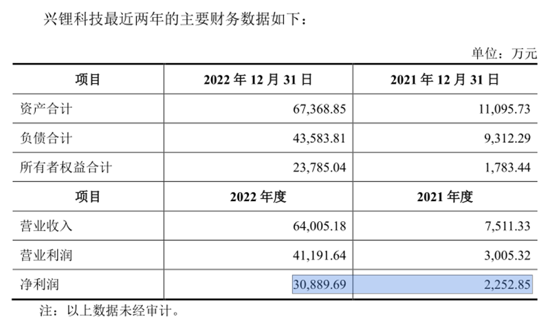 興鋰科技的凈利潤,2022年3.09億元,2021年2252.85萬元,同比增長12.71倍。