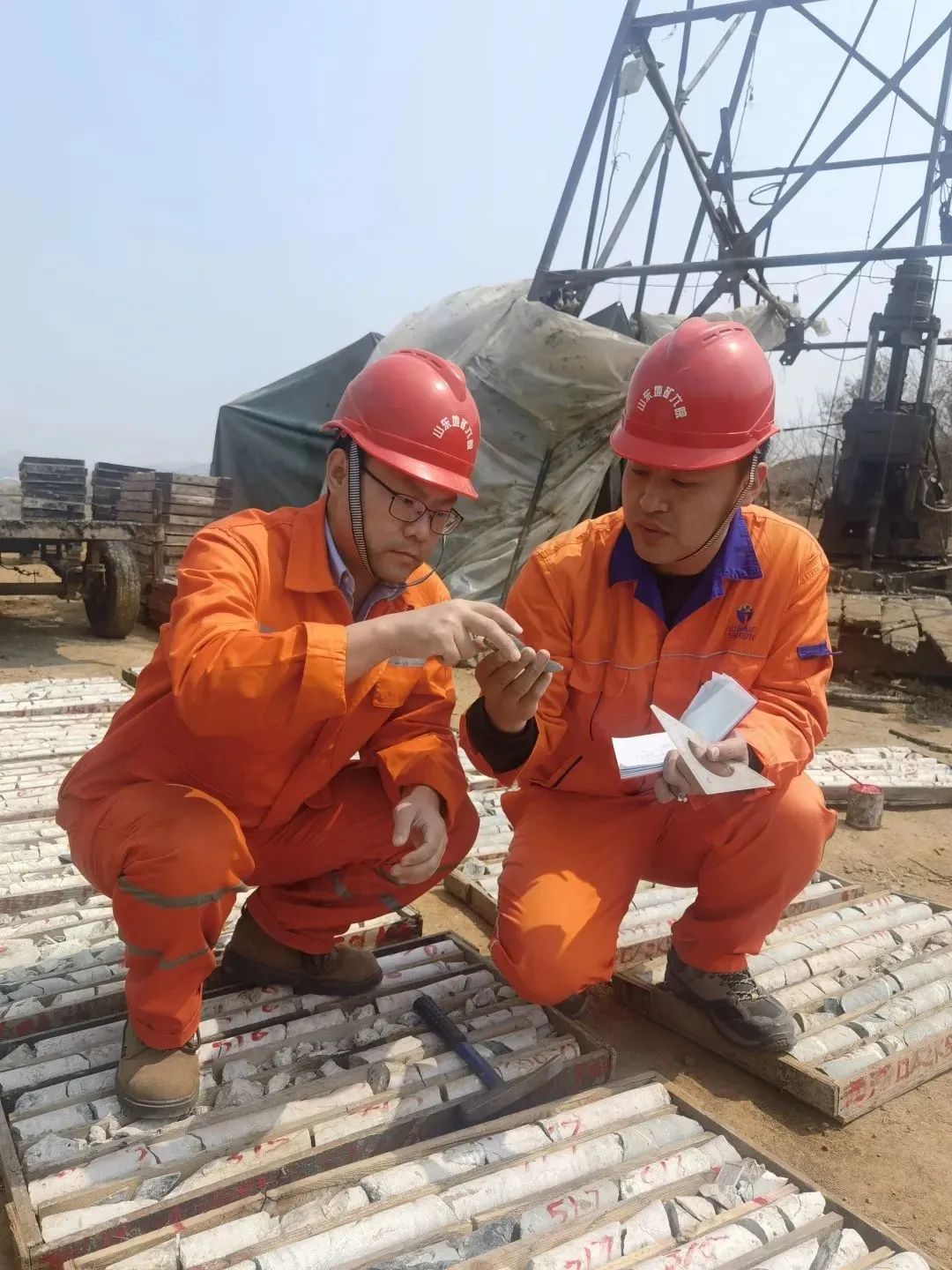 山東地礦六隊(duì)地質(zhì)人員查看鉆取的金礦巖心