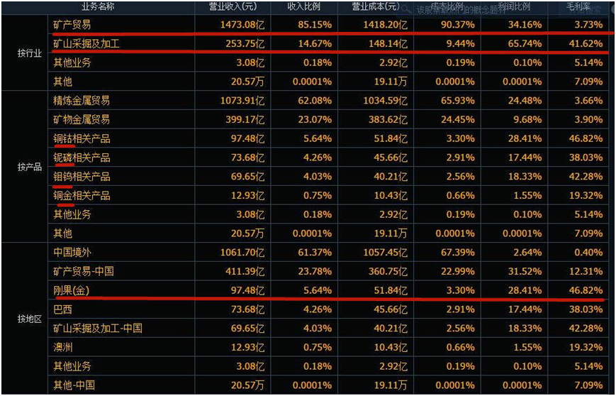 2022年,洛陽鉬業(yè)實(shí)現(xiàn)營(yíng)業(yè)收入1729.91億元,凈利潤(rùn)為60.67億元,雖然創(chuàng)造歷史最好業(yè)績(jī),但相比于近2000億元的營(yíng)收,其實(shí)際的凈利潤(rùn)率并不高,而細(xì)看主營(yíng)業(yè)務(wù),其占了收入85%的礦產(chǎn)貿(mào)易,毛利率只有3.73%!而其礦產(chǎn)采掘和加工的業(yè)務(wù)的毛利率達(dá)到了41.62%,貢獻(xiàn)了總利潤(rùn)的65.74%。