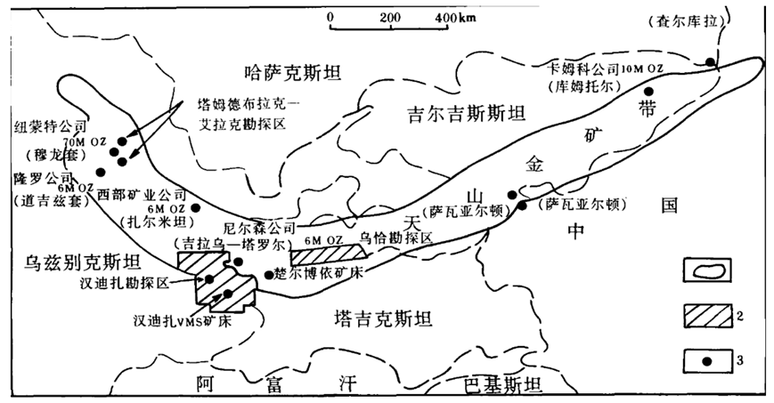 天山西段,從烏茲別克斯坦向東,經(jīng)塔吉克斯坦、吉爾吉斯斯坦到中國新疆,構成了世人矚目的巨型金成礦帶,即“亞洲金腰帶”。烏茲別克斯坦、吉爾吉斯斯坦等幾個國家在這條成礦帶上發(fā)現(xiàn)了眾多大型、超大型金礦。其中,最為著名的當屬于烏茲別克斯坦的穆龍?zhí)捉鸬V床,該礦是世界級超大型獨立金礦床,遠景資源儲量預估1.7億盎司(5287.6噸),平均品位約3.5克/噸。該礦2022年生產(chǎn)了約1700盎司(約48.2噸)的黃金,是全球第二大在產(chǎn)金礦。