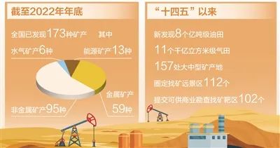 一組數(shù)字揭示成果:截至2022年年底,全國(guó)已發(fā)現(xiàn)能源礦產(chǎn)13種,金屬礦產(chǎn)59種,非金屬礦產(chǎn)95種,水氣礦產(chǎn)6種;“十四五”以來(lái),新發(fā)現(xiàn)8個(gè)億噸級(jí)油田、11個(gè)千億立方米級(jí)氣田、157處大中型礦產(chǎn)地,圈定找礦遠(yuǎn)景區(qū)112個(gè),提交可供商業(yè)勘查找礦靶區(qū)102個(gè)?!皬哪壳扒闆r看,新一輪找礦突破戰(zhàn)略行動(dòng)進(jìn)展順利,時(shí)間過(guò)半、任務(wù)過(guò)半,預(yù)期能夠完成既定目標(biāo)。”自然資源部地質(zhì)勘查管理司司長(zhǎng)熊自力說(shuō)。