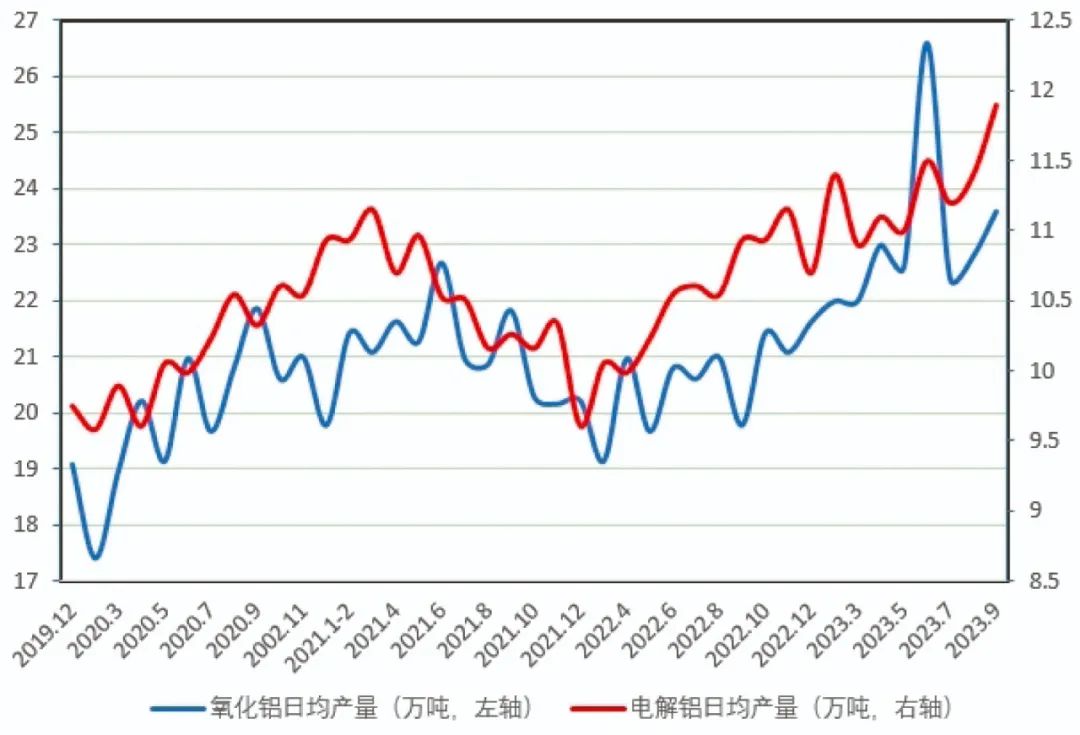 二是生產(chǎn)總體保持平穩(wěn)。9月份,全國(guó)電解鋁和氧化鋁的產(chǎn)能產(chǎn)量總體保持平穩(wěn)。部分地區(qū)電解鋁企業(yè)減產(chǎn),主要集中在云南地區(qū),云南地區(qū)枯水期將近,用電調(diào)節(jié)開始施行,部分電解鋁企業(yè)被要求提前采取電力負(fù)荷管控措施,實(shí)施降負(fù)荷運(yùn)行,省內(nèi)計(jì)劃第一輪壓減相關(guān)電解鋁企業(yè)約20%產(chǎn)能,預(yù)計(jì)減產(chǎn)規(guī)模約為115萬(wàn)噸。9月份,全國(guó)電解鋁產(chǎn)量為357.7萬(wàn)噸,同比上升5.3%,日均產(chǎn)量11.9萬(wàn)噸,環(huán)比上升0.3萬(wàn)噸 ,同比上升0.6萬(wàn)噸;氧化鋁產(chǎn)量為707.2萬(wàn)噸,同比上升1.6%,日均產(chǎn)量23.6萬(wàn)噸,環(huán)比上升0.8萬(wàn)噸,同比上升0.1萬(wàn)噸。鋁冶煉產(chǎn)品月度日均產(chǎn)量見圖5。