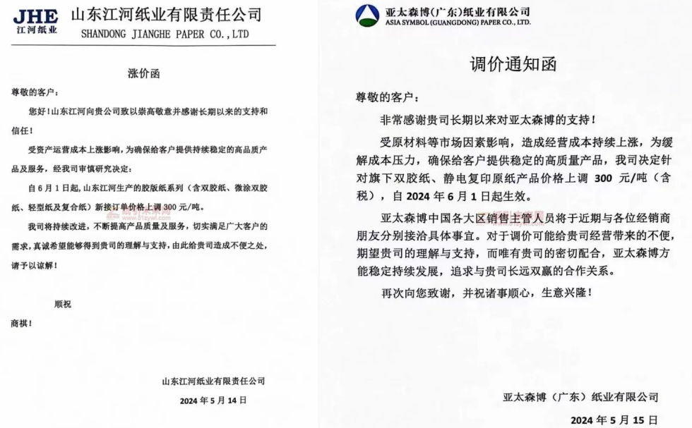隨著文化用紙行業(yè)巨頭們的一紙公告,市場迎來了6月1日的統(tǒng)一價格上調,每噸產(chǎn)品提價300元。山東江河紙業(yè)新接訂單價格上調300元/噸,山東華泰紙業(yè)所有文化紙系列產(chǎn)品價格上調300元/噸,山東晨鳴紙業(yè)文化紙產(chǎn)品價格上調300元/噸,亞太森博(廣東)紙業(yè)針對旗下雙膠紙、靜電復印原紙產(chǎn)品價格上調300元/噸(含稅)。