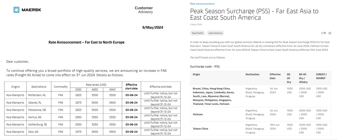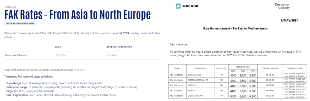 船公司們宣布新一輪運價調整計劃,馬士基和達飛兩大航運巨頭已宣布6月再提價計劃,上調北歐FAK費率。其中,馬士基每40尺柜最高5900美元,達飛再次上調1000美元,每40尺柜6000美元。赫伯羅特、HMM等船公司繼續(xù)調整部分航線的費率,涉及歐地、非洲、南美、北美等。5月上旬美線(運價)已經(jīng)連漲了兩次,每次各漲了1000美元左右,漲價還將繼續(xù),并將在5月下旬飆升到5000美元以上。