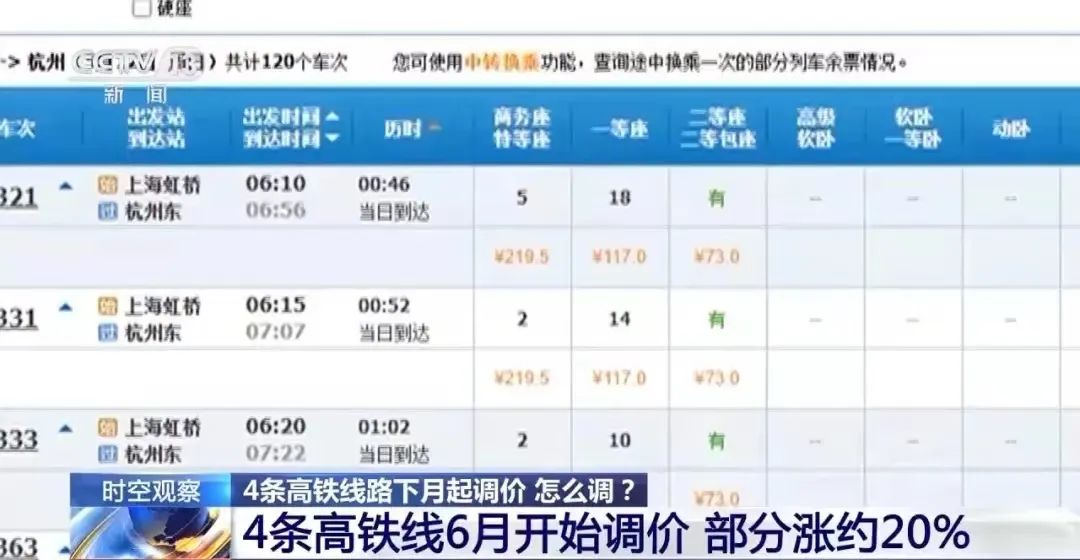 鐵路12306官網(wǎng)發(fā)布四則調價公告,自6月15日調整京廣高鐵武廣段、滬昆高鐵滬杭段、滬昆高鐵杭長段、杭深鐵路杭甬段等4條熱門高鐵線路票價,漲幅在19%-20%左右。