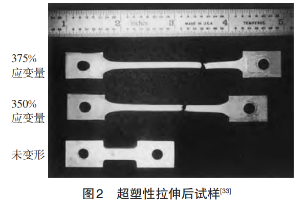 TROEGER等對6000系合金的超塑性研究表明,500 ℃以上時合金表現(xiàn)出超塑性。在 540 ℃應(yīng)變速率為2×10-4~5×10-4 /s時,應(yīng)變速率敏感性達到最大值0.5 /s。應(yīng)變速率為5×10-4 /s時合金的單向拉伸延伸率最大達375%,對應(yīng)的流變應(yīng)力為4.7 MPa,如圖2所示。周義等用鋁合金以超塑性成形方式進行了汽車前擋泥板成形試驗,在成形溫度控制在450~500 ℃、最大脹形壓力達到0.42 MPa的條件下,試驗取得成功,整個成形時間為 30~60 min。梁繼業(yè)等以 5083 鋁合金為研究對象對車門的鋁合金外板的正反脹超塑性成形工藝進行了研究,在480 ℃和應(yīng)變速率為 1×10-3 /s 條件下,最大伸長可達到242%。雖然超塑性成形時間比一般成形工藝時間長,但在成形時材料塑性流動的阻力非常小,即使是復(fù)雜件也可以一次成形,因而其應(yīng)用前景非常廣泛。