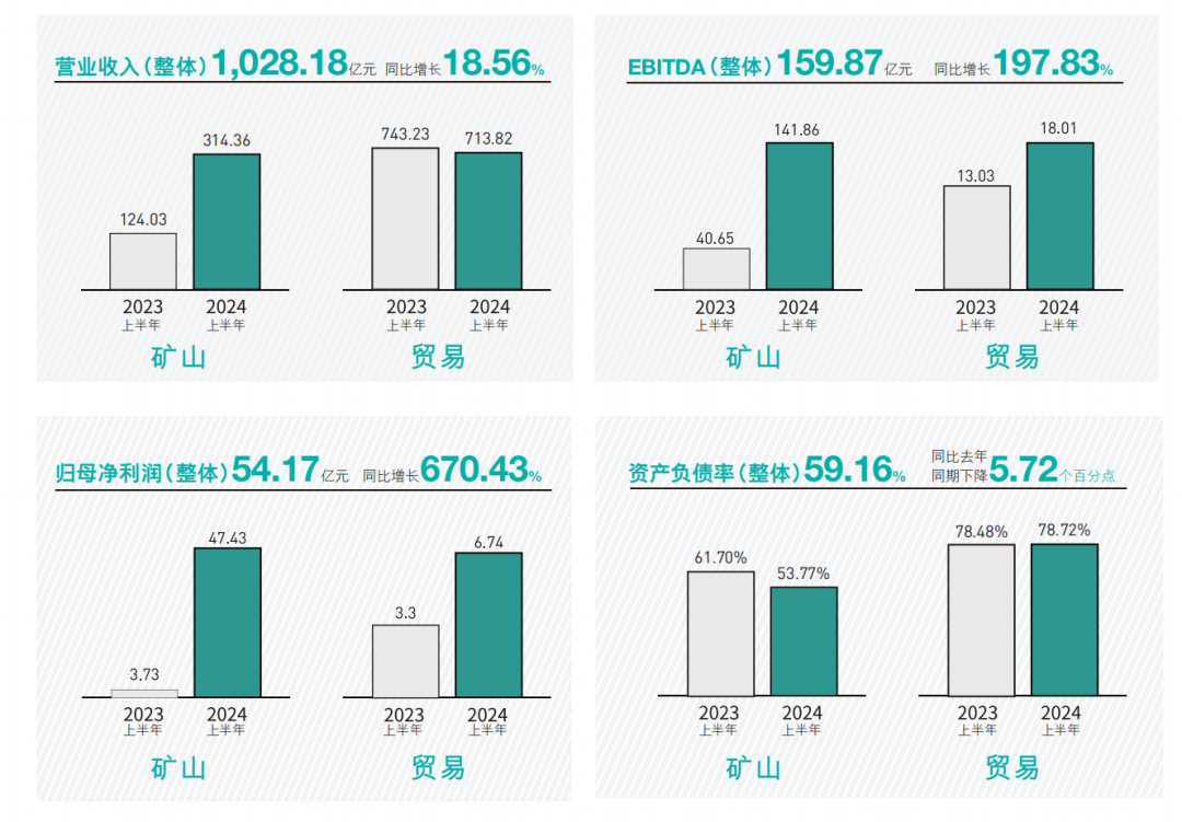 8月23日晚,洛陽鉬業(yè)發(fā)布的2024年中期報告顯示,上半年公司實現(xiàn)營業(yè)收入1028.18億元,同比增長18.56%,實現(xiàn)歸母凈利潤54.17億元,同比增長670.43%,均創(chuàng)下歷史新高;實現(xiàn)息稅折攤前利潤159.87億元,增長197.83%,資產(chǎn)負(fù)債率59.16%,同比下降5.72個百分點。同時,公司流動性充裕,上半年經(jīng)營性凈現(xiàn)金流108億元,持有現(xiàn)金及現(xiàn)金等價物309億元。