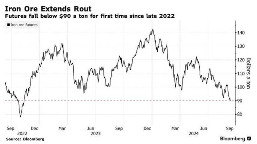 9月9日,新加坡鐵礦石期貨價格周一亞洲時段早盤跌幅一度高達2.3%,至每噸89.60美元,自2022年11月以來首次跌破了90美元大關,為22個月以來最低水平。國內(nèi)青島港的鐵礦石價格也跌至90美元/干噸左右。昔日被業(yè)內(nèi)譽為“瘋狂的石頭”的鐵礦石,如今正在以罕見的速度向下墜落。