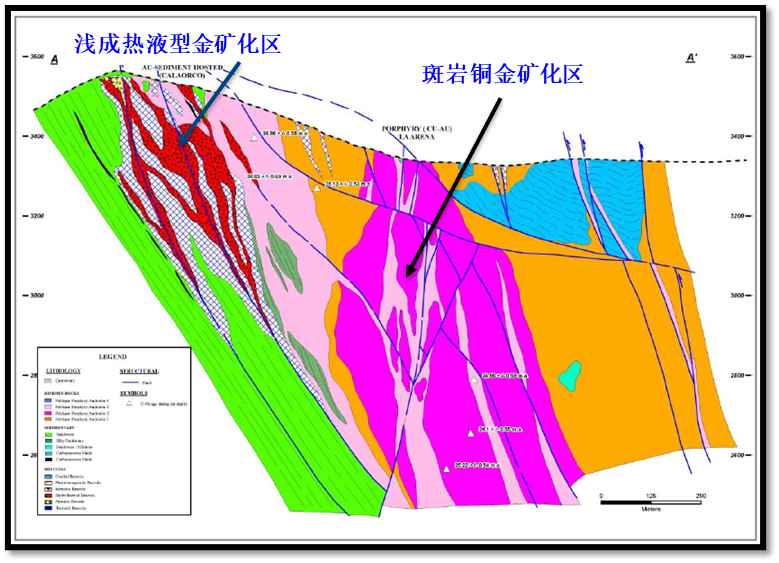 La Arena項(xiàng)目有兩種礦床類型,分別為西南部的高硫淺成低溫?zé)嵋盒徒鸬V床和東北部的斑巖型銅金礦床,礦體整體呈“上金下銅”狀態(tài)分布。