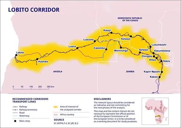 洛比托走廊項(xiàng)目意在改變非洲現(xiàn)有礦產(chǎn)供應(yīng)格局,獲取非洲鈷、鎳等關(guān)鍵礦產(chǎn),是美歐提出并推進(jìn)洛比托走廊項(xiàng)目的最重要目的。洛比托走廊建設(shè)以沿線鐵路修復(fù)和建設(shè)為主,全長(zhǎng)約2000公里,穿越安哥拉、剛果(金)和贊比亞三國(guó),將后兩國(guó)的銅礦帶與安哥拉大西洋港口洛比托連接。目前剛果(金)和贊比亞的銅、鈷等重要礦產(chǎn)主要走公路經(jīng)南非、莫桑比克港口向東方出口,一般耗時(shí)30天左右,大部分進(jìn)入中國(guó);走廊建成后,剛果(金)東南部的礦產(chǎn)品鐵路運(yùn)往洛比托港口的平均運(yùn)輸時(shí)間約8天,剛果(金)和贊比亞的礦產(chǎn)品將向西從洛比托港出口,更方便進(jìn)入歐美市場(chǎng)。
