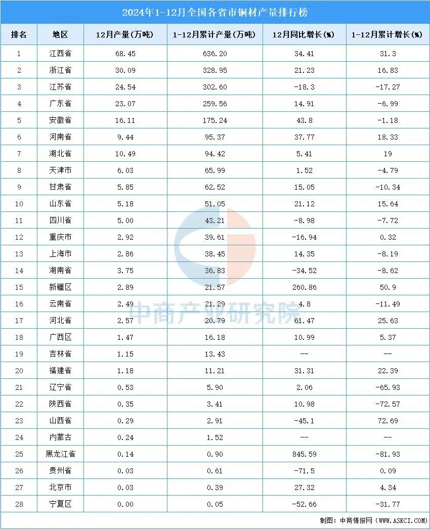 我國銅材產(chǎn)量主要集中在華東區(qū)域,占比約為65.68%,其次是華南(11.73%)、華中(9.64%)、西南(4.46%)、華北(3.90%)、西北(3.73%)、東北(0.86%)。共有28個(gè)省份生產(chǎn)銅材,前三名占據(jù)半壁江山。