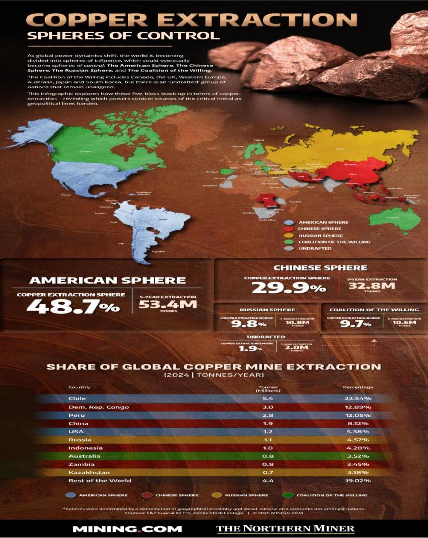 從世界維度來看,美國作為頭號資本強(qiáng)國,通過跨國礦業(yè)巨頭控制著全球眾多優(yōu)質(zhì)銅礦資源。美國本土占主導(dǎo)的是斑巖型銅礦,依賴大規(guī)模露天開采和先進(jìn)選礦技術(shù),環(huán)保成本較高,銅礦平均品位較低(0.4%-0.6%),低于智利(0.7%-1%),開采成本較高(全球前10大低成本銅礦中無美國項目)。出于資本逐利的本性,跨國礦業(yè)巨頭優(yōu)先“掐尖”占有和開發(fā)全球成本最低的優(yōu)質(zhì)銅礦,這也是美國國內(nèi)銅礦開發(fā)滯后的一個重要原因。近期MINING網(wǎng)站和北方礦業(yè)從地緣政治的角度繪制了銅資源控制全球地圖,根據(jù)地理、社會、文化和經(jīng)濟(jì)聯(lián)系以及在更加兩極分化的世界中可能出現(xiàn)的結(jié)盟,將世界的銅資源分成五個“控制范圍”:美國、中國、俄羅斯、自愿聯(lián)盟和未開發(fā)。過去五年,美國以48.7%的全球銅產(chǎn)量領(lǐng)先,中國以29.9%緊隨其后,俄羅斯和自愿聯(lián)盟各占不到10%,還有1.9%未被開發(fā)。通過此圖可以看出,美國資本所控制的跨國礦業(yè)集團(tuán)還是優(yōu)先開發(fā)全球具有成本競爭力的銅礦項目。