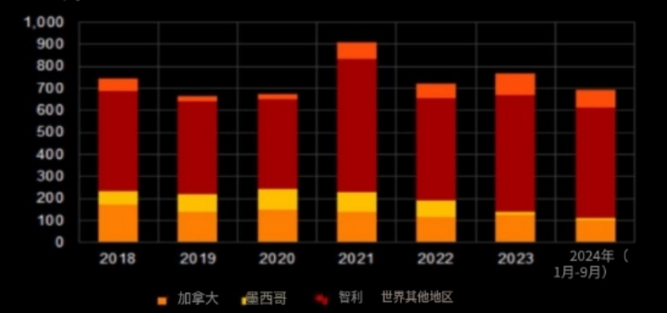 根據(jù)2025年USGS發(fā)布數(shù)據(jù),2024年美國共有25個銅礦山,其中17個占總產(chǎn)量99%以上。由于礦石品位降低,銅礦產(chǎn)量比2023年下降3%,國內(nèi)開采銅產(chǎn)量為110萬噸,位列全球第五。精煉銅產(chǎn)量為89萬噸,比2023年略有增長,位居全球第六。精煉銅進(jìn)口81萬噸,主要來自智利65%、加拿大17%、墨西哥9%、秘魯6%、其他國家3%?;厥浙~約占美國銅供應(yīng)的35%,美國是世界上最大的廢銅出口國,每年出口近百萬噸,大部分被運(yùn)到中國進(jìn)行加工。通過以上數(shù)據(jù)可以看出,一方面是美國國內(nèi)銅礦資源開發(fā)緩慢,另一方面是國內(nèi)冶煉加工能力短板凸顯。