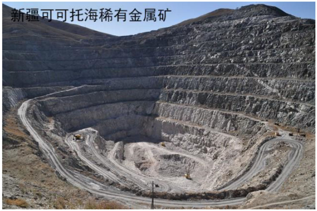 中國鈹?shù)V產(chǎn)資源豐富,分布在14個(gè)省區(qū)。中國已探明的鈹儲量以伴生礦產(chǎn)為主,主要與鋰、鉭鈮礦伴生(占48%),其次與稀土礦伴生(占27%)或與鎢礦伴生(占20%)。花崗偉晶巖型是我國最主要的鈹?shù)V類型,約占總儲量的一半,主要產(chǎn)于新疆(圖1.2)、四川、云南等地。熱液石英脈型鈹?shù)V具有規(guī)模中等、品位較富、礦物結(jié)晶較粗等特點(diǎn),主要分布在中南及華東地區(qū)?;◢弾r型鈹?shù)V多見于地槽褶皺帶,成礦時(shí)代以中生代為主,如新疆青河縣阿斯喀爾特鈹?shù)V;另一種以鉭鈮為主,伴生鈹?shù)认∮薪饘伲缃饕舜?14礦。中國鈹?shù)V產(chǎn)資源具有分布高度集中、單一礦床少、共伴生礦床多、品位低、儲量大等特點(diǎn)。