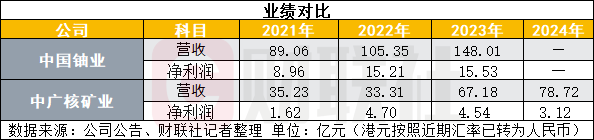 從業(yè)績方面來看,中國鈾業(yè)實(shí)力較中廣核礦業(yè)更強(qiáng),2021-2023年中國鈾業(yè)營收分別為89.06億元、105.35億元、148.01億元,凈利潤分別為8.96億元、15.21億元、15.53億元;2021-2024年中廣核礦業(yè)營收分別為38.60億港元、36.49億港元、73.60億港元、86.24億港元,凈利潤分別為1.78億港元、5.15億港元、4.97億港元、3.42億港元。