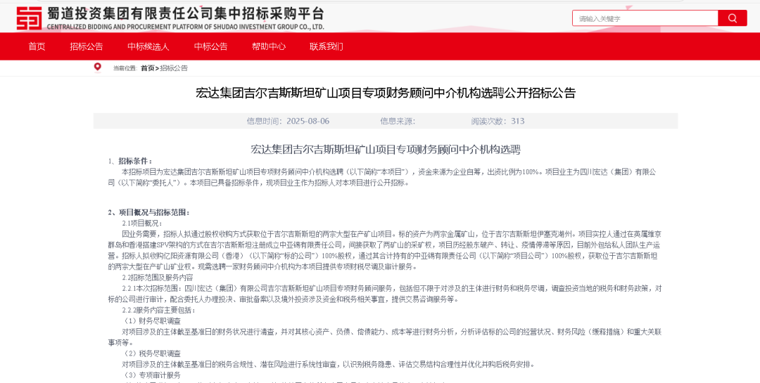 消息源于蜀道投資集團(tuán)集中招標(biāo)采購平臺(tái)發(fā)布的《宏達(dá)集團(tuán)吉爾吉斯斯坦礦山項(xiàng)目專項(xiàng)財(cái)務(wù)顧問中介機(jī)構(gòu)選聘公開招標(biāo)公告》。公告顯示,宏達(dá)集團(tuán)計(jì)劃收購億陽資源有限公司 (香港) 100% 股權(quán),通過這一操作,將間接掌控中亞錫有限責(zé)任公司100% 股權(quán),進(jìn)而獲取位于吉爾吉斯斯坦伊塞克湖州的兩宗大型在產(chǎn)礦山礦業(yè)權(quán)。為順利推進(jìn)收購,宏達(dá)集團(tuán)正在公開選聘一家財(cái)務(wù)顧問中介機(jī)構(gòu),為項(xiàng)目提供專項(xiàng)財(cái)稅盡調(diào)及審計(jì)服務(wù),項(xiàng)目資金全部來源于企業(yè)自籌。