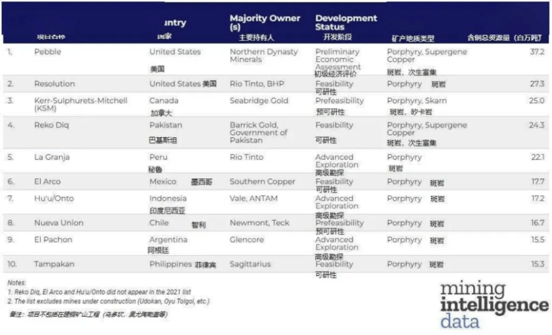 外媒Mining Intelligence根據(jù)三級(jí)(探明、推定和推測)資源量更新了世界十大未開發(fā)銅礦項(xiàng)目。前兩的未開發(fā)銅礦均位于美國。